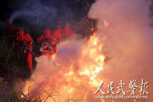 根据预定方案,此次演练任务是利用GPS定位仪寻找火场。全体官兵共分为两组,分别按照指定地理坐标到达火场左右两翼,然后根据情况采取合理战术迅速将明火扑灭。官兵们携带灭火装备在各组长的带领下,快速机动赶往火场。由于夜间路况不明,加之气温急剧下降,大家只能以快速行进来抵御寒冷。组长们按照定位仪指示,在丛林中边寻找捷径边鼓励大家快速前进。经过半个多小时的奔袭,灭火突击队们终于到达“火场”。接下来,指挥员在预先准备的场地点燃明火,官兵们根据地势、风向等特点,采用“分兵合围”的灭火方式成功将明火扑灭。