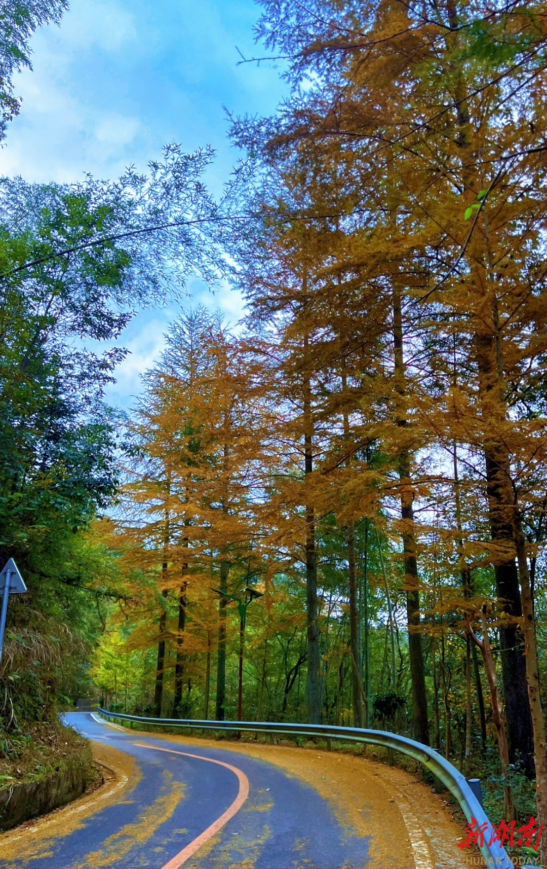 湖南日报·新湖南客户端11月7日讯(通讯员 伍震辉 唐湘媛 龚韧)当秋意漫过新化县渠江源的山峦,这片藏在湘中的秘境,便成了调色盘里最惊艳的一笔。如果你问,秋天的渠江源是什么颜色?那一定是银杏的金、金钱松的橙、竹海的翠,在蓝天白云的映衬下,晕染出的一幅流动的山水画卷。